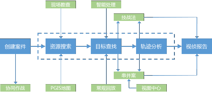 依据公安机关案件视频侦查业务进行业务流程设计,将案件视频侦查过程抽象模型化,归纳总结为:创建案件、资源搜索、目标查找、轨迹分析、视侦报告五个过程。