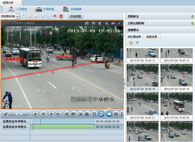 对视频文件进行智能化分析,设置排查规则,快速定位行为、人员、车辆目标视频,提高特定目标的搜索效率。对视频中的所有运动目标轨迹进行分析,将不同的运动目标拼接到同一个场景中进行播放,大大缩短视频浏览时间。