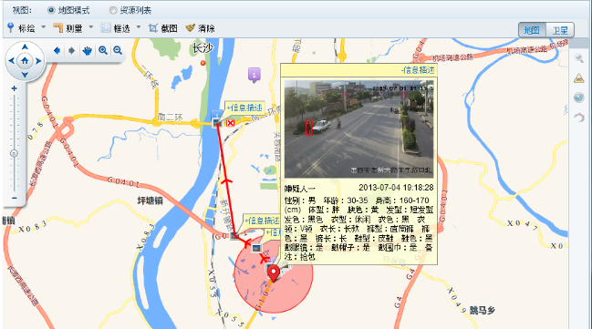 依据案发地点,系统在PGIS地图上自动显示案发周边的公安自建镜头、卡口、社会监控点。利用资源搜索或框选、线选、圆选、多边形选等手段在可能出现嫌疑目标的范围内批量查找监控点,并支持将监控点关联到该案件,利于后期研判,缩小侦查范围。