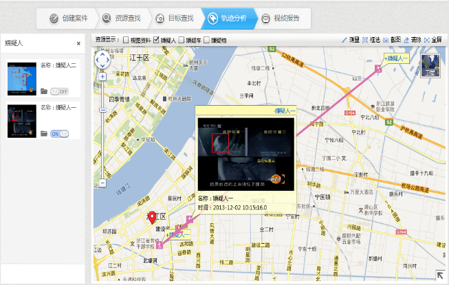 基于视频侦查相关标准的现场标绘功能,能够在平面地图中标绘案发现场的信息,包括摄像头点位信息、案发地点、案发区域、嫌疑人作案路线,能够帮助技术人员直观的分析案件信息。
