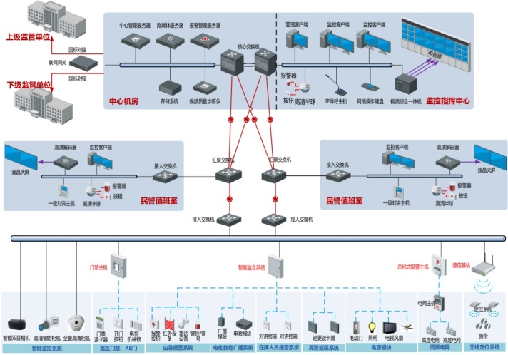 智慧型平安监所系统集成拓扑结构,如下图所示: