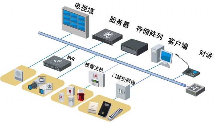 保险行业安防高清监控系统一般分为视频监控系统、入侵报警系统、门禁控制系统等,系统总体架构如下图所示: